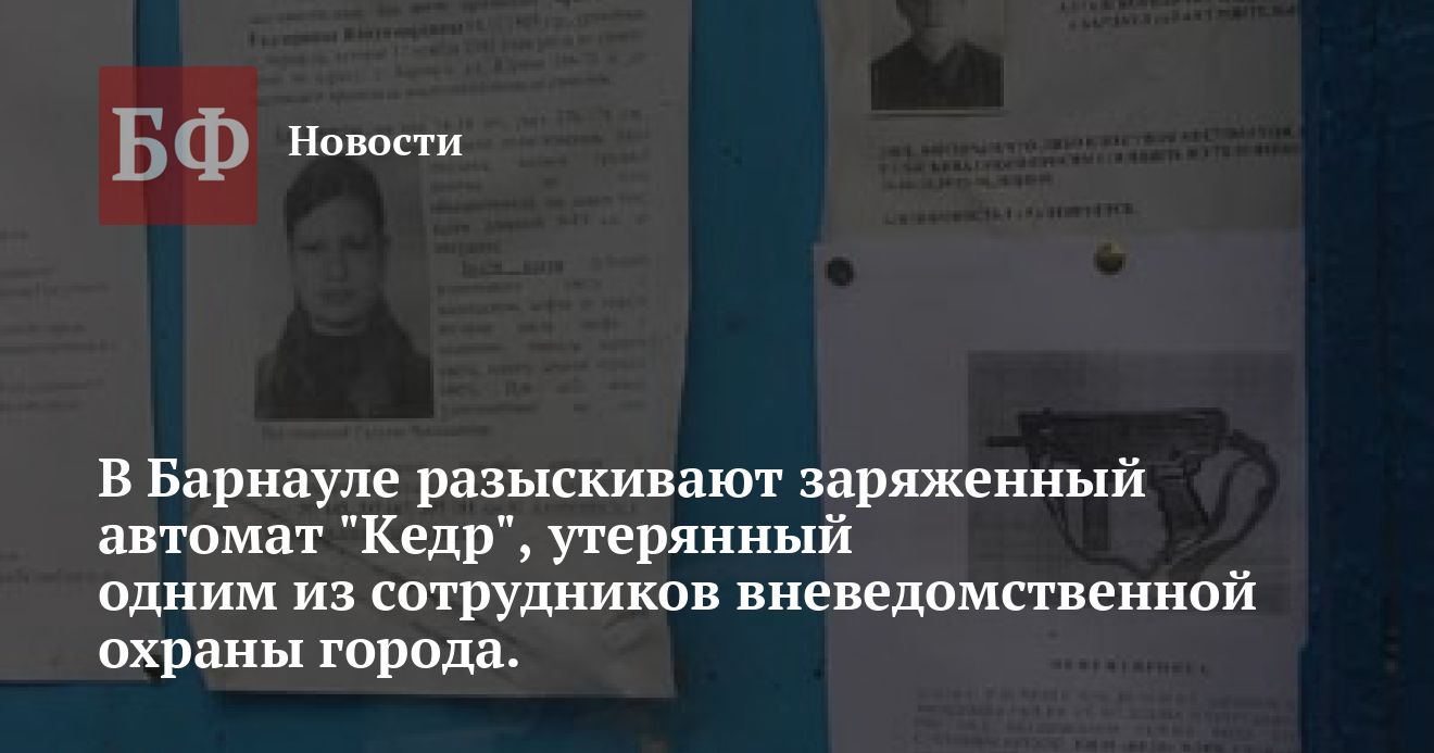 В нем говорится, «22.07.06 г. в период с 10.00 до 10.30 в Барнауле на пос. Западный в районе ул. Чеглецова, 35 сотрудником ОВО при ОВД Октябрьского района было утрачено служебное оружие ПП-91 „Кедр“ N2450, 1 магазин с 20 патронами, 1995 года выпуска».