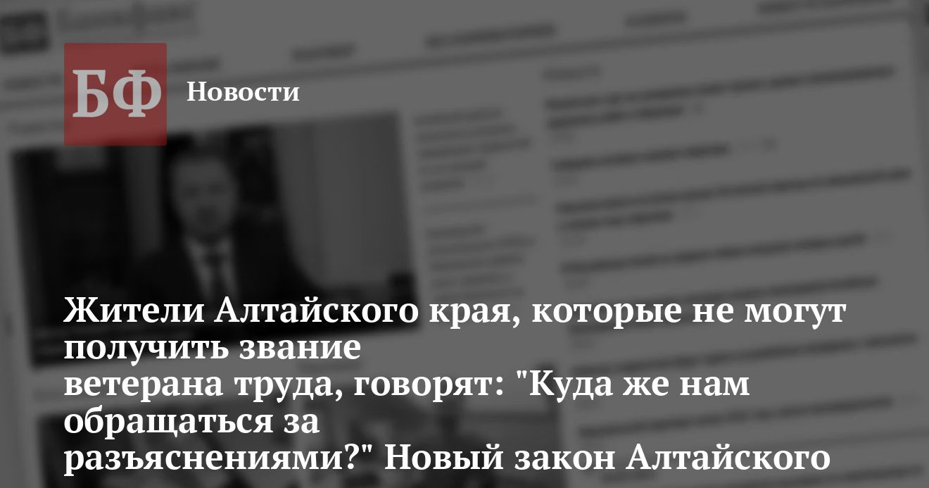 Право на получение звания «Ветеран труда Алтайского края» определяется законом Алтайского края от 15.04.2005 № 24-ЗС «О присвоении звания «Ветеран труда Алтайского края».