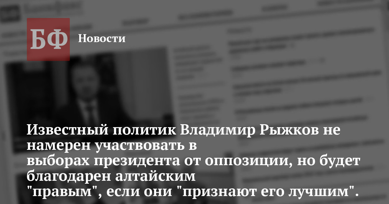 Известный политик Владимир Рыжков не намерен участвовать в выборах президента от оппозиции, но будет благодарен алтайским «правым», если они «признают его лучшим».