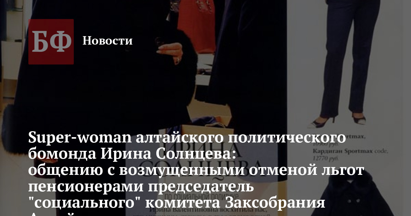 27 октября нормальный ход работы Заксобрания и администрации Алтайского края был нарушен — высокопоставленные чиновники наперебой поздравляли г-жу Солнцеву с днем рождения и дарили ей многочисленные подарки. Апофеозом стал торжественный прием в Малом зале краевой администрации. Инсайдеры в КЗС выражают досаду по поводу того, что юбилей председателя социального комитета был слегка омрачен волнениями пенсионеров, в течение двух дней осаждавших краевую администрацию и требовавших вернуть им социальные проездные. Докучливые льготники даже умудрились прорваться в Большой зал «Голубого дома» одновременно со скромным личным праздником алтайской Super-woman, в результате чего ряд званых туда гостей не попал на прием, а был вынужден долго разъяснять непонятливым старикам как власть, неуклонно радея и неусыпно рачея, заботится об их благе, предлагая им 12,5 бесплатных поездок на общественном транспорте в месяц.