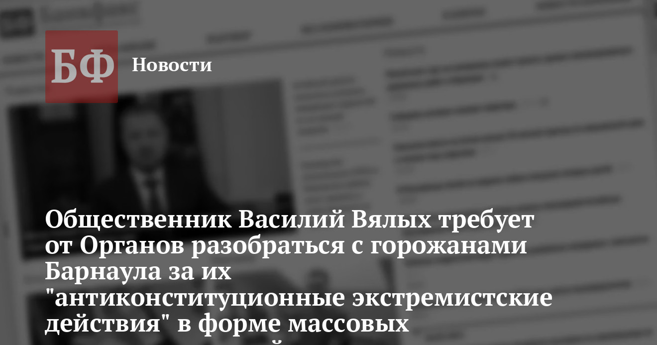 Общественник Василий Вялых требует от Органов разобраться с горожанами Барнаула за их «антиконституционные экстремистские действия» в форме массовых уличных волнений стариков, возмущенных попыткой властей урезать их льготы. Документальная публикация.