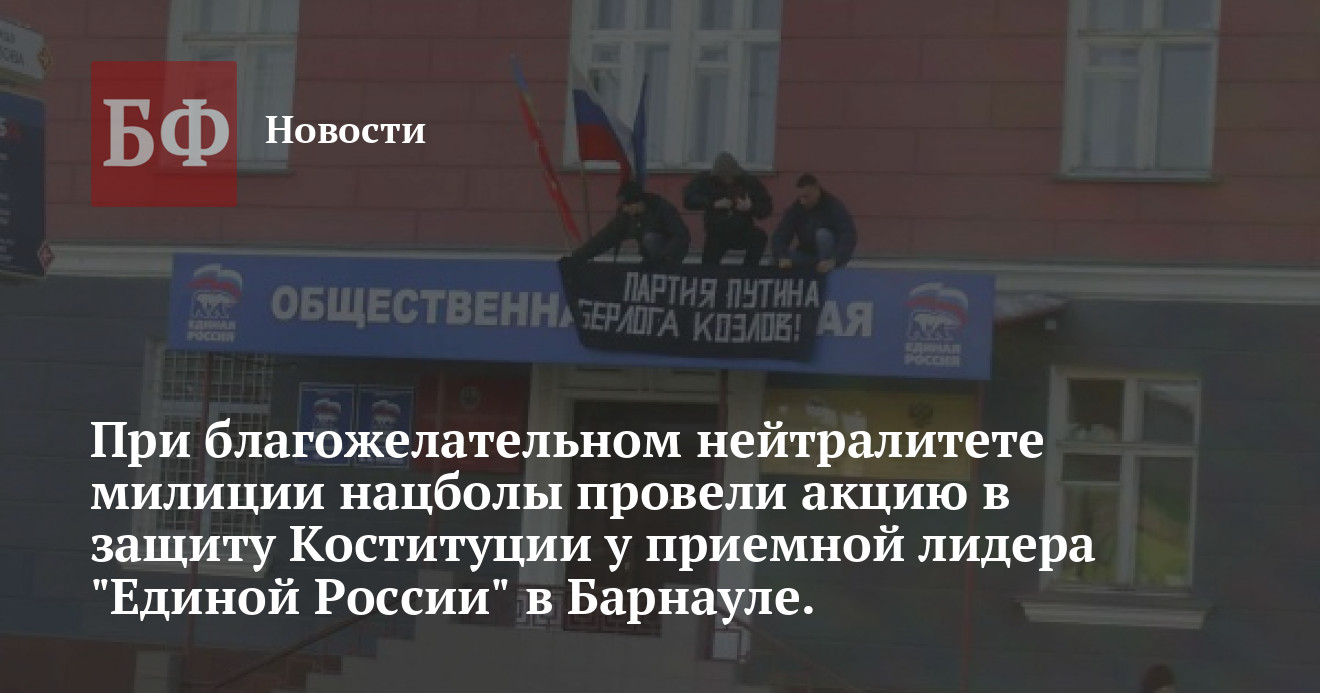 В это время участники акции, находившиеся внутри приемной, передали единороссам листовки-обращения и присоединились к митингующим. В процессе акции были озвучены следующие лозунги: «Мы вас научим Конституцию любить!», «Долой неоцаризм!», «Долой самодержавие и престолонаследника!», «Свободу России!», «Нет изменению Конституции!» и проч.