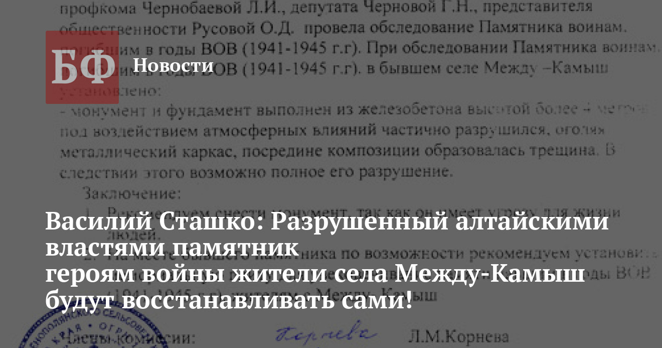 — В этой связи, представляя интересы группы жителей с. Между-Камыш (г. Барнаула, с. Ключи, с. Зеленая Поляна, с. Слава, с. Новая Полтава и др.) я вынужден со всей ответственностью заявить, что памятник был снесен умышленно, а решение о сносе было принято на основании акта экспертизы, проведенного бывшей главой сельского совета Л. М. Корневой и бывшими доярками совхоза Зеленая Поляна Л. И. Чернобаевой, Г. Н. Черновой и О. Д. Русовой, — утверждает этот известный на Алтае гражданский активист. Кстати говоря, принявшая решение об уничтожении памятника чиновница больше не является главой сельсовета — она не смогла подтвердить свой статус на прошлогодних выборах, и как поговаривают в селах, значительную роль тут сыграло глухое недовольство жителей района скандальной историей с памятником.