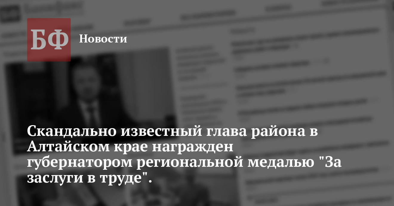 Скандально известный глава района в Алтайском крае награжден губернатором региональной медалью «За заслуги в труде».
