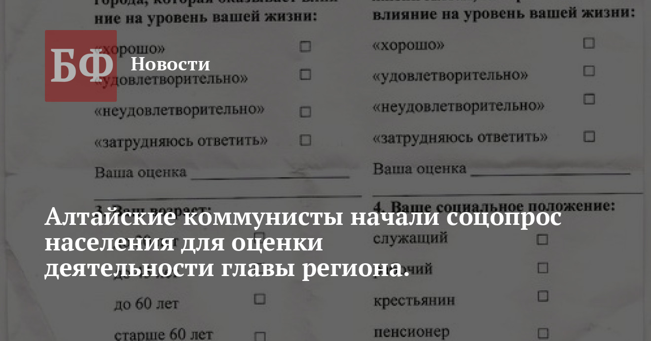 Напомним, 22 января на заседании Госсовета РФ президент Дмитрий Медведев заявил, что оценку деятельности глав регионов должен определять их рейтинг среди населения. После того, как члены КПРФ на Алтае столкнулись с «признаками очередной антикоммунистической кампании» (запрет на проведение собраний в Барнауле и Рубцовске, запрет на работу депутата АКЗС Игоря Вольфсона в здании краевого парламента во внерабочее время) — они решили сами выяснить, каков же реальный рейтинг у губернатора, и доложить об этом президенту.