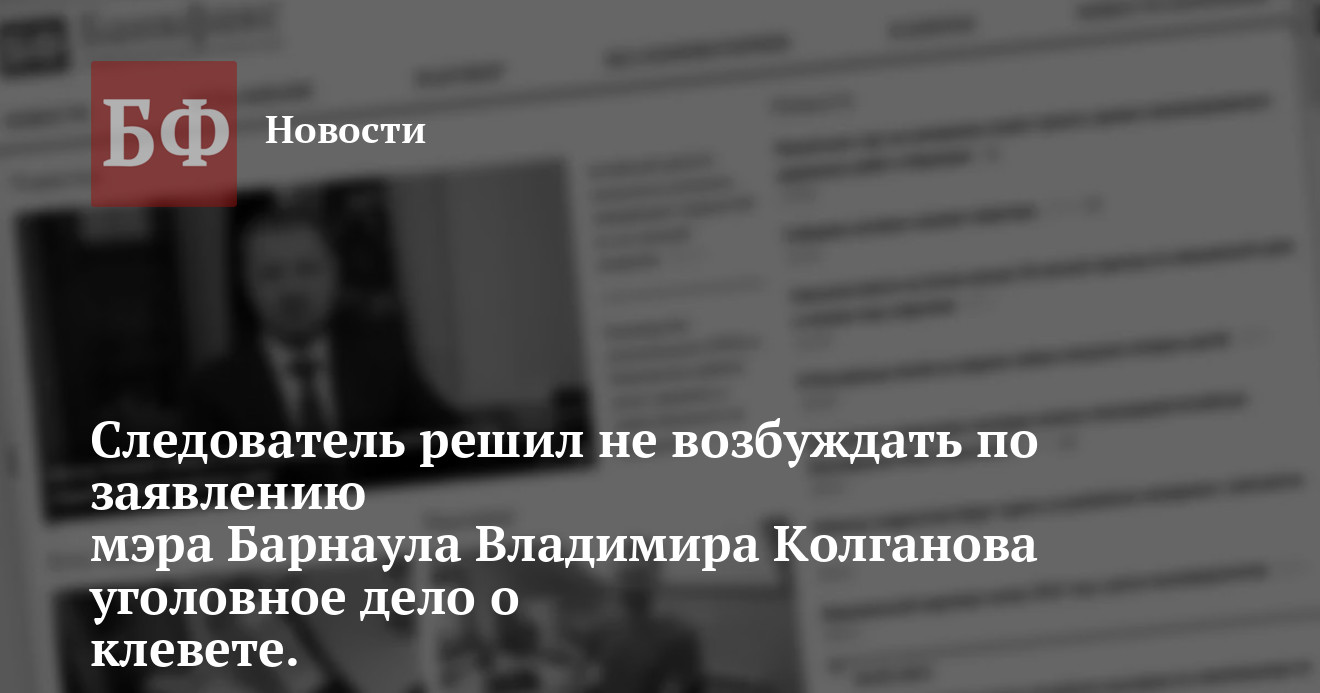 дела о клевете по заявлению мэра Барнаула Владимира Колганова. Об этом ИА «Банкфакс» 11 марта сообщил следователь по особо важным