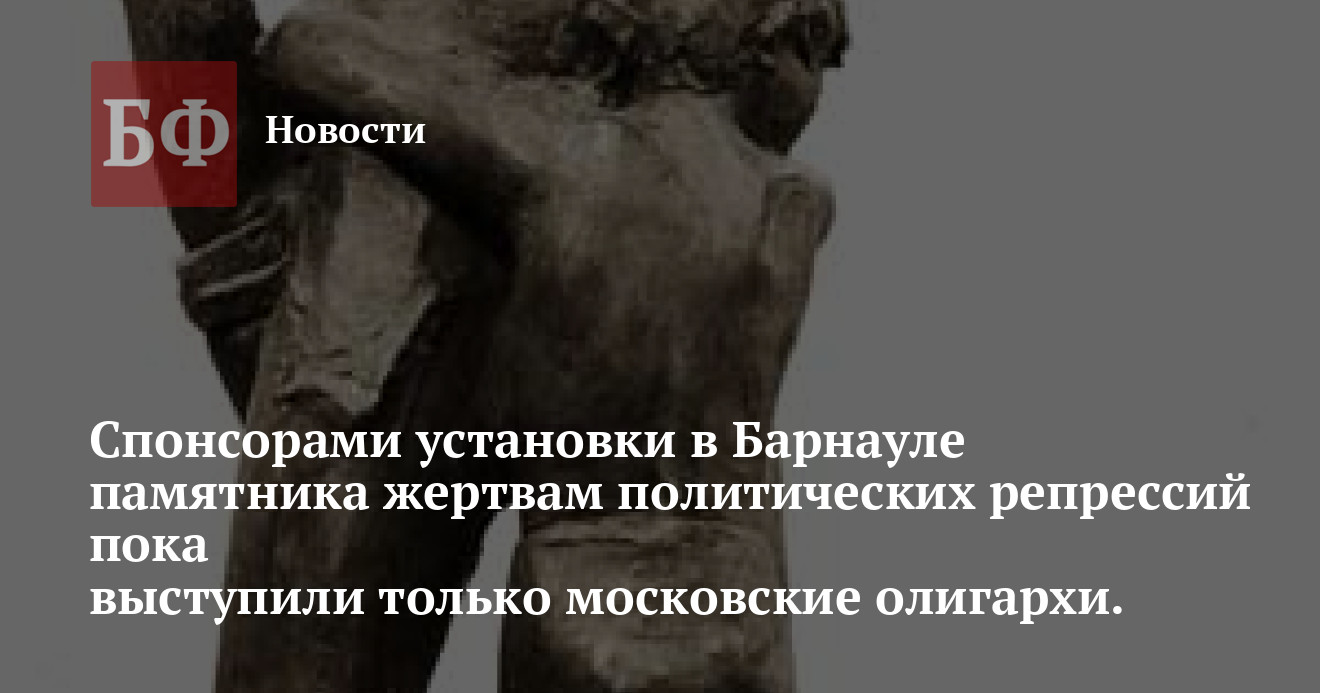 Как сообщили организаторы установки в Барнауле памятника жертвам политрепрессий, на реализацию проекта потребуется около 6,5 млн рублей. На данный момент средства на изготовление памятника готовы пожертвовать московские спонсоры. В их числе — ВТБ 24, Фонд династии Дмитрия Зимина, личные средства пожертвовали также председатель правления ВТБ 24 Михаил Задорнов, бывший владелец НИК, а ныне депутат Госдумы Александр Лебедев. В настоящее время достигнуты договоренности с Фондом Михаила Прохорова. Организаторы также отмечают, что будут рады, если в числе благотворителей окажутся и алтайские предприниматели.