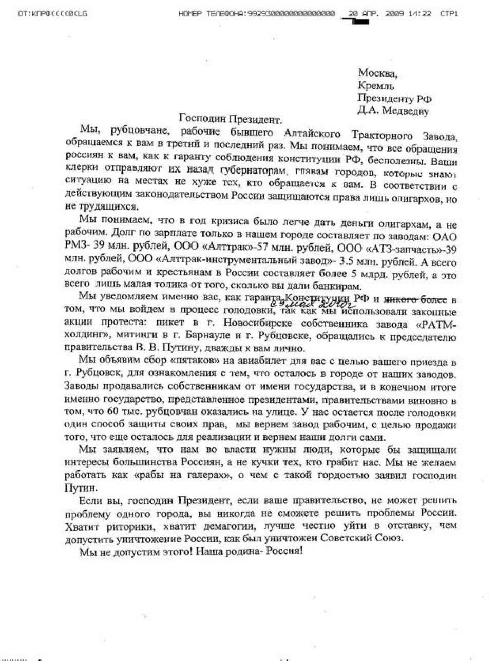 «Третье и последнее» обращение рабочих рубцовских заводов к президенту России Дмитрию Медведеву распространила 20 апреля
