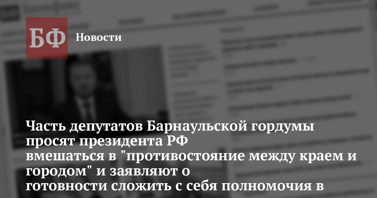 В случае продолжения действий со стороны Администрации Алтайского края, направленных против законно избранных городских властей, значительная часть депутатов Барнаульской городской Думы готова досрочно сложить с себя полномочия в знак протеста.