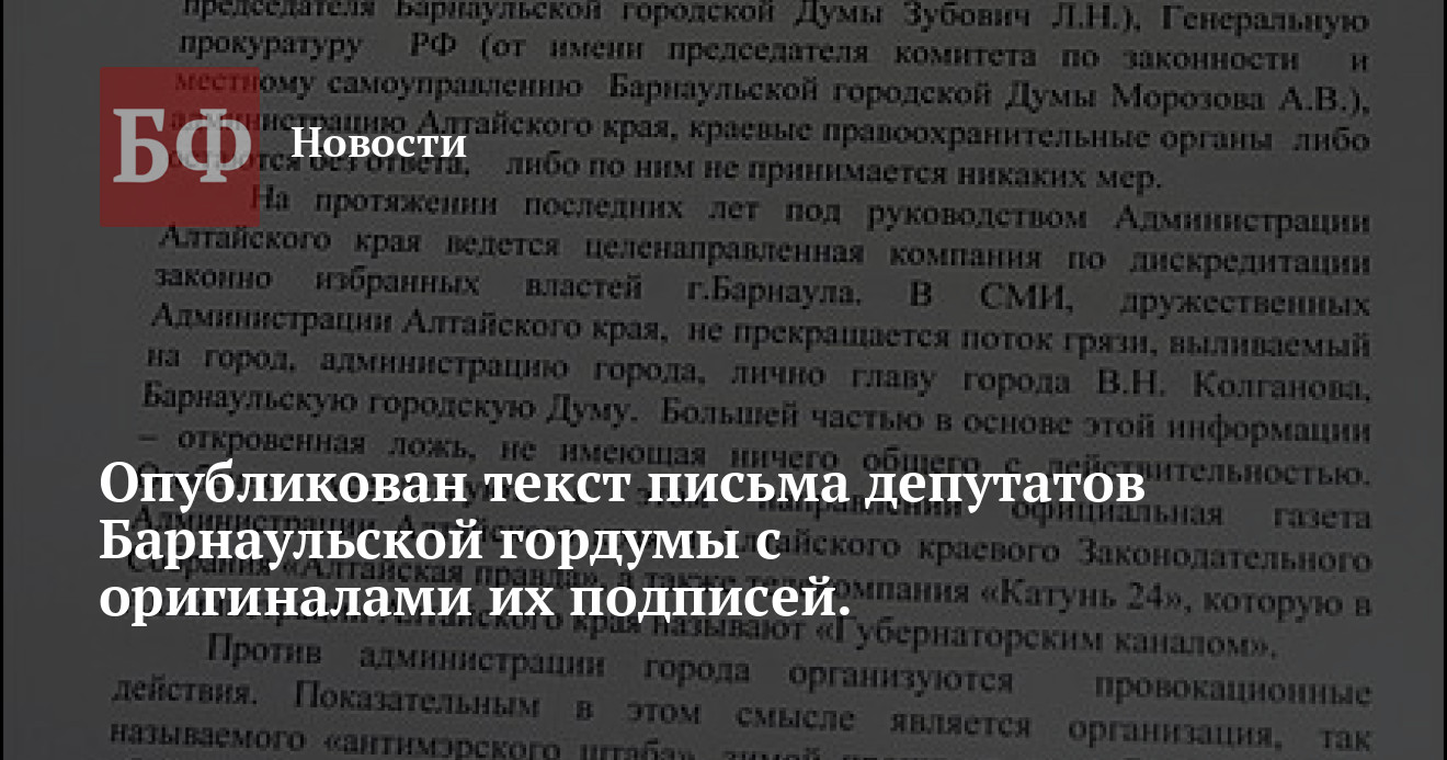 Опубликован текст письма депутатов Барнаульской гордумы с оригиналами их подписей.