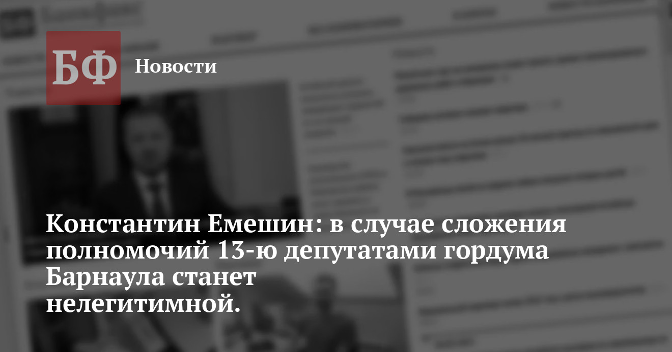 — Суть заключается в том, что если 13 депутатов, которые якобы написали заявления, действительно сложат полномочия и покинут думу, то Барнаульская гордума будет вовсе неполномочна, — замечает Константин Емешин — Так, согласно п. 1 ст. 35 ФЗ N 131 «Об общих принципах организации местного самоуправления в РФ» «Представительный орган муниципального образования может осуществлять свои полномочия в случае избрания не менее двух третей от установленной численности депутатов». Тем самым далее по округам, на которых депутаты уволятся с должности, должны быть назначены перевыборы.
