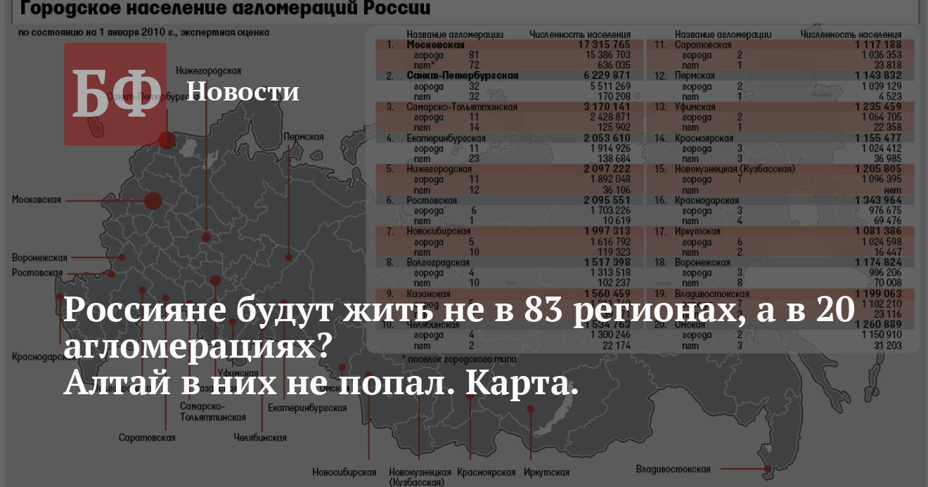 Стоит отметить, впрочем, достаточно поверхностный подход авторов к декларируемым агломерациях. Так, в Сибири декларируется создание пяти агломераций из двадцати. При этом все они выглядят достаточно странными или просто отражают сложившееся сегодня положение дел. В частности, Иркутская, Красноярская и Омские агломерации в сложившейся схеме расселения, миграционных потоков и транспортной доступности имеют долговременный устойчиво негативный прогноз роста населения и не располагают ресурсами в виде объемного населения малых городов. Таким ресурсом в Сибири сегодня обладают лишь Алтайский край и Кузбасс. В последнем также предполагается создать агломерацию, но в достатчоно странной конфигурации — на основе неформальной столицы южного, угледобывающего Кузбасса — Новокузнецка и большого количества окружающих его малых и средних шахтерских городов. При этом региональную столицу — Кемерово, связанную с Новокузнецком хорошим четырехрядным шоссе, вводить в состав агломерации не планируется. Полностью не попадает в планы агломераторов и Алтай. Достаточно жизнеспособной выглядит новосибирская агломерация — но она заявлена лишь в тех границах, в которых естественно сложилась к настоящему времени. При этом в планах никак не отражены естественные процессы наращивания агломерационных связей вдоль основной транспортной магистрали Сибири — М-52 по линии Новосибирск — Барнаул- Бийск — Горно-Алтайск, где активное развитие агломерационных процессов сдерживается сегодня лишь низким логистическим потенциалом отдельных участков магистрали.