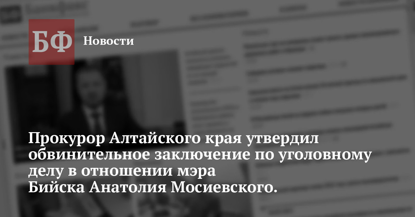 Прокурор Алтайского края Яков Хорошев утвердил обвинительное заключение по уголовному делу мэра Бийска Анатолия Мосиевского. Об этом 17 ноября сообщили в пресс-службе краевой прокуратуры.