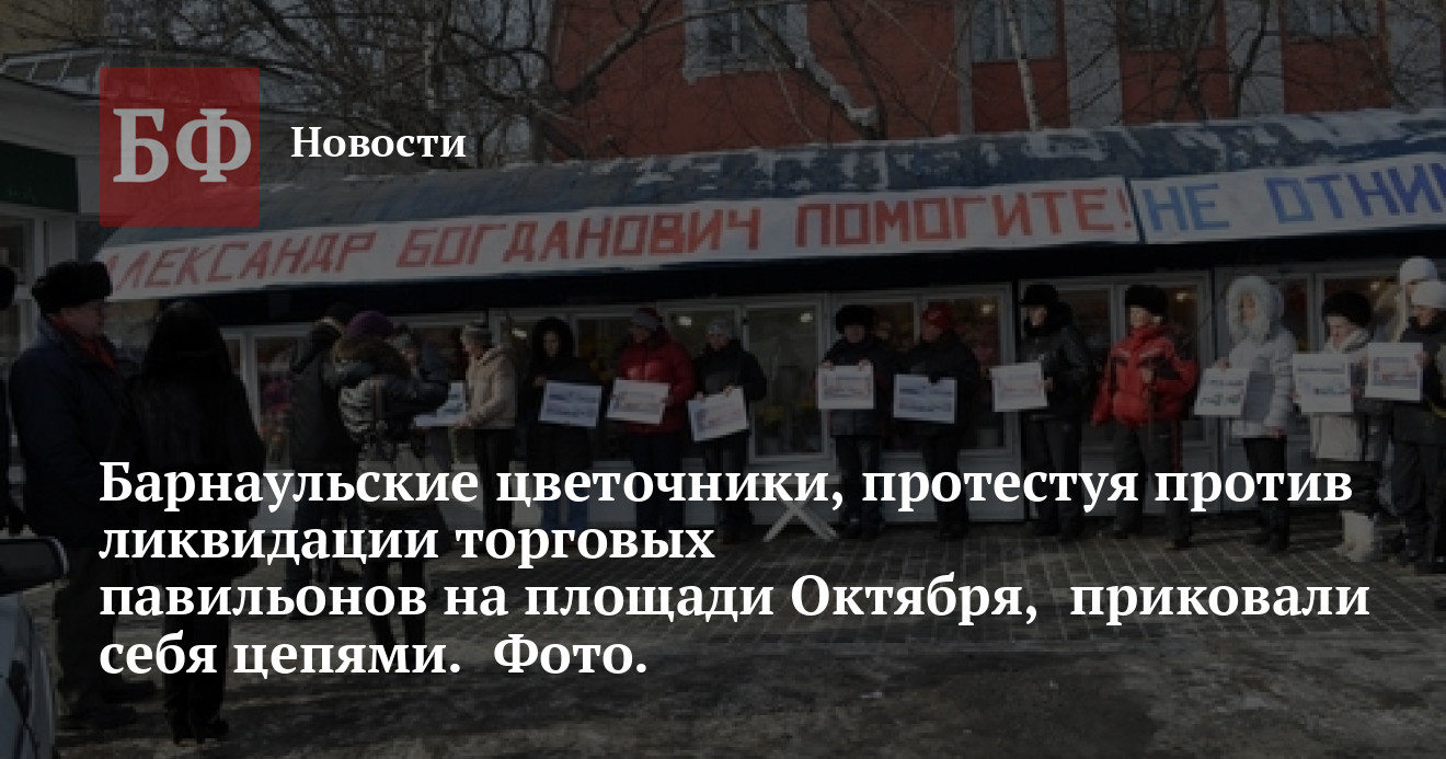 Как сообщает пресс-служба Алтайского крайкома КПРФ, цепи, которыми приковали себя цветочники к металлическим конструкциям рынка, с 14 марта становятся обязательным атрибутом и днём, и ночью (рынок работает круглосуточно). Примечательно, что большинство из арендаторов самого популярного в Барнауле цветочного рынка на площади Октября, это матери-одиночки. Они приковали себя цепями к торговому ряду, чтобы сохранить цветочный рынок, от силового сноса к которому власти могут приступить уже 16 марта. Предположительно, рынок сносится для расположения на его месте торговых точек аффилированных с властью структур.