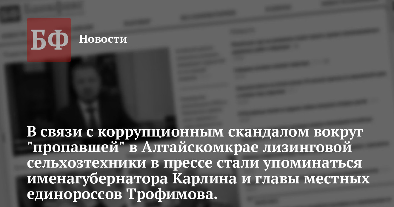 «Мы нашли сельхозтехнику, в пропаже которой признался Путину глава «Росагролизинга» Назаров," - заявила 15 мая опубликовавшая материал Виталия Баранцова «Новая газета». Среди фигурантов коррупционного скандала на сей раз упоминаются фамилии более высокопоставленных чиновников — помимо руководства краевого ГУСХ, подозрения в причастности к манипуляциям высказываются в адрес главы «Росагролизинга», губернатора Алтайского края и лидера местных единороссов, председателя Совета директоров контролируемого краевыми властями «Сибсоцбанка» Бориса Трофимова. Предлагаем вам ознакомиться с полным текстом статьи.