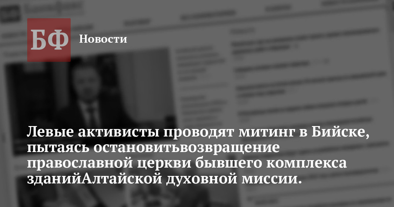 Левые активисты проводят митинг в Бийске, пытаясь остановитьвозвращение православной церкви бывшего комплекса зданийАлтайской духовной миссии.