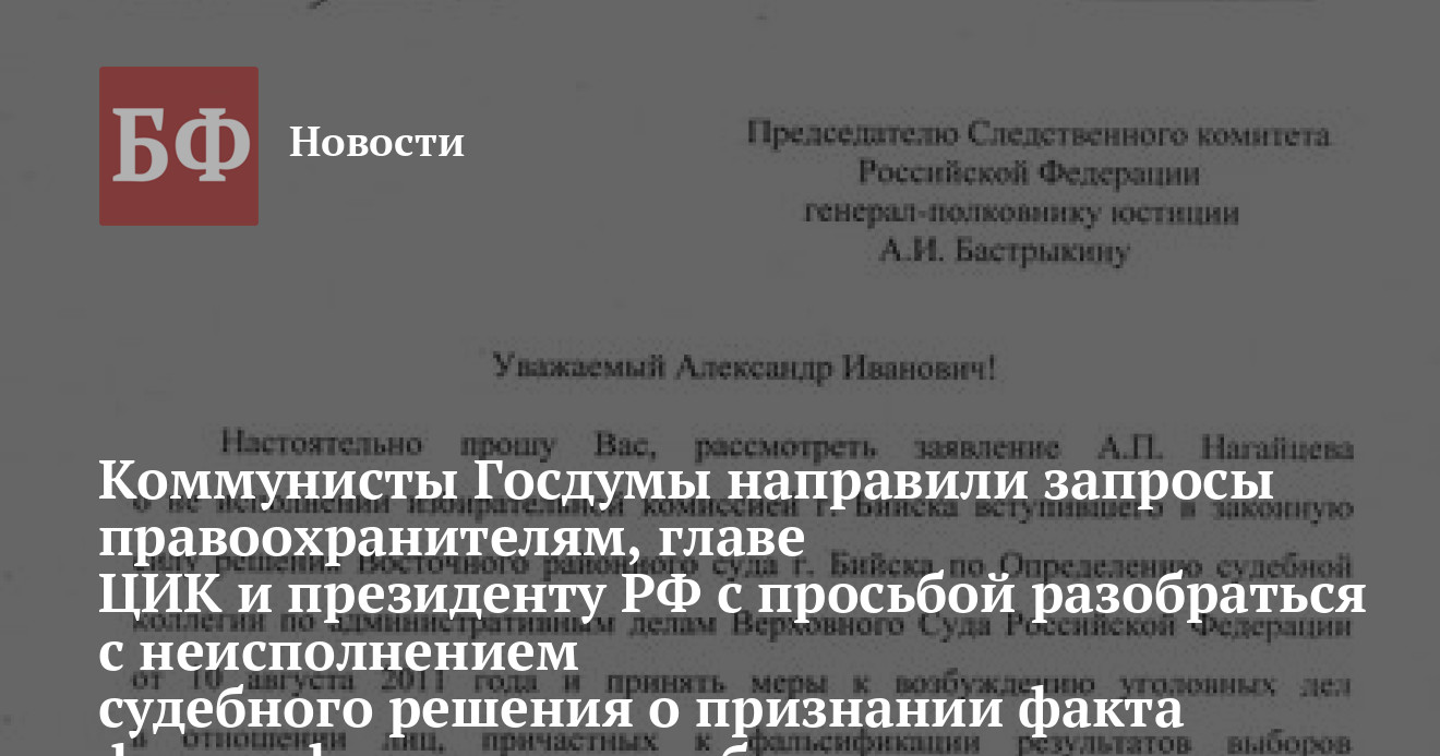 Также, как сообщил экс-кандидат в мэры Бийска, коммунист Андрей Нагайцев, 27 января, по поручению лидера партии Геннадия Зюганова, в ходе правительственного часа председатель комитета ГД по региональной политике Николай Харитонов доложит информацию о ситуации «правового беспредела в Алтайском крае».