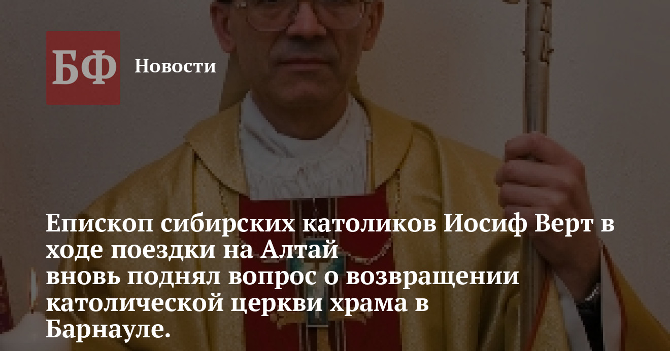 В администрации Алтайского края епископ продолжил переговоры о возвращении католической церкви ее исторического храмового здания в центре Барнаула. Напомним, впервые этот вопрос был поднят им в конце января 2010 года на конференции католических епископов России. Тогда Иосиф Верт выразил надежду, что католикам России вернут их храмы, построенные до 1917 года. С февраля 2011 года краевые власти рассматривают официальное заявление барнаульской религиозной католической организации о передаче в собственность общины нежилого помещения по проспекту Ленина, 44 (где сейчас расположена муниципальная «Аптека N1» — прим. ред. «БФ»).
