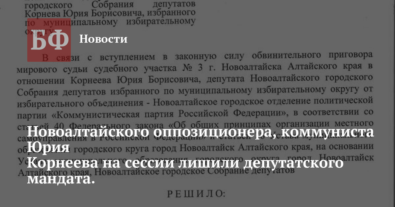избранного депутата-коммуниста Юрия Корнеева был внесён на рассмотрение депутатами горсобрания фракции «Единая Россия».