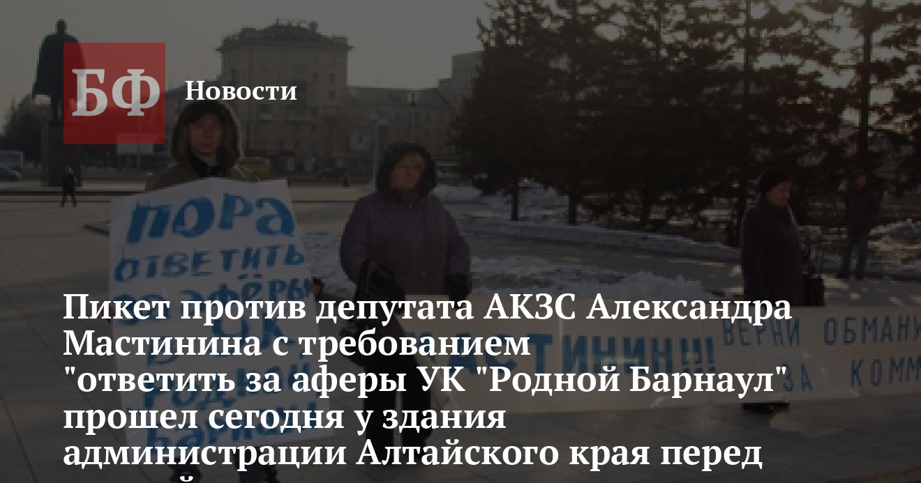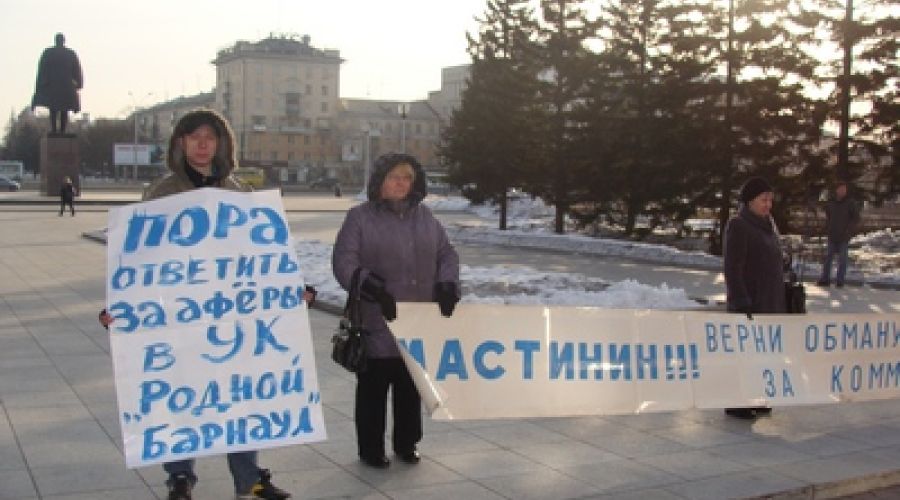 Плакаты пикетчиков гласили: «Мастинин, верни обманутым деньги за комуслуги», «Пора ответить за аферы УК «Родной Барнаул», «Мастинину импичмент барнаульцев».