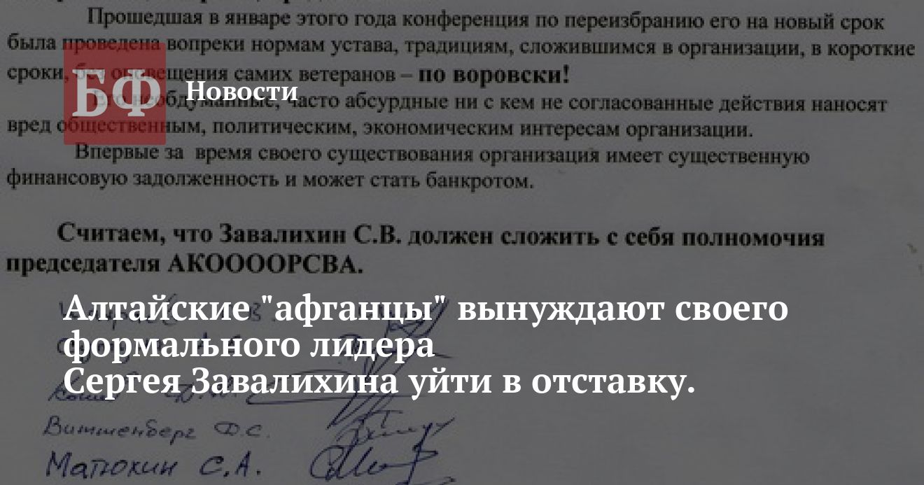 «Сбор подписей под таким письмом ведется, — подтвердил один из подписавшихся, член алтайского отделения РСВА, в прошлом — член правления организации и руководитель АРО ООО Инвалидов войны в Афганистане Сергей Овчинников. — Юридической силы у этого документа как таковой нет — это просто наш способ по-доброму сказать „уходи“ человеку, к которому действительно есть множество претензий. Любой здравомыслящий на его месте это должен понять и принять соответствующее решение».