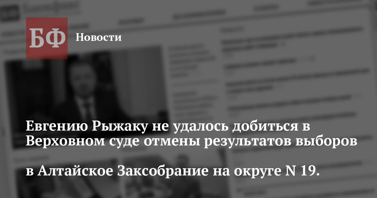 Сторона представитель известной на Алтае предпринимательской семьи, опального единоросса Евгения Рыжака была не согласна с частичным удовлетворением требований и пыталась в Верховном суде добиться отмены результатов выборов на округе. Напомним, на 19-м округе победил действующий спикер АКЗС Иван Лоор. Однако ВС РФ оставил решение суда первой инстанции в силе.