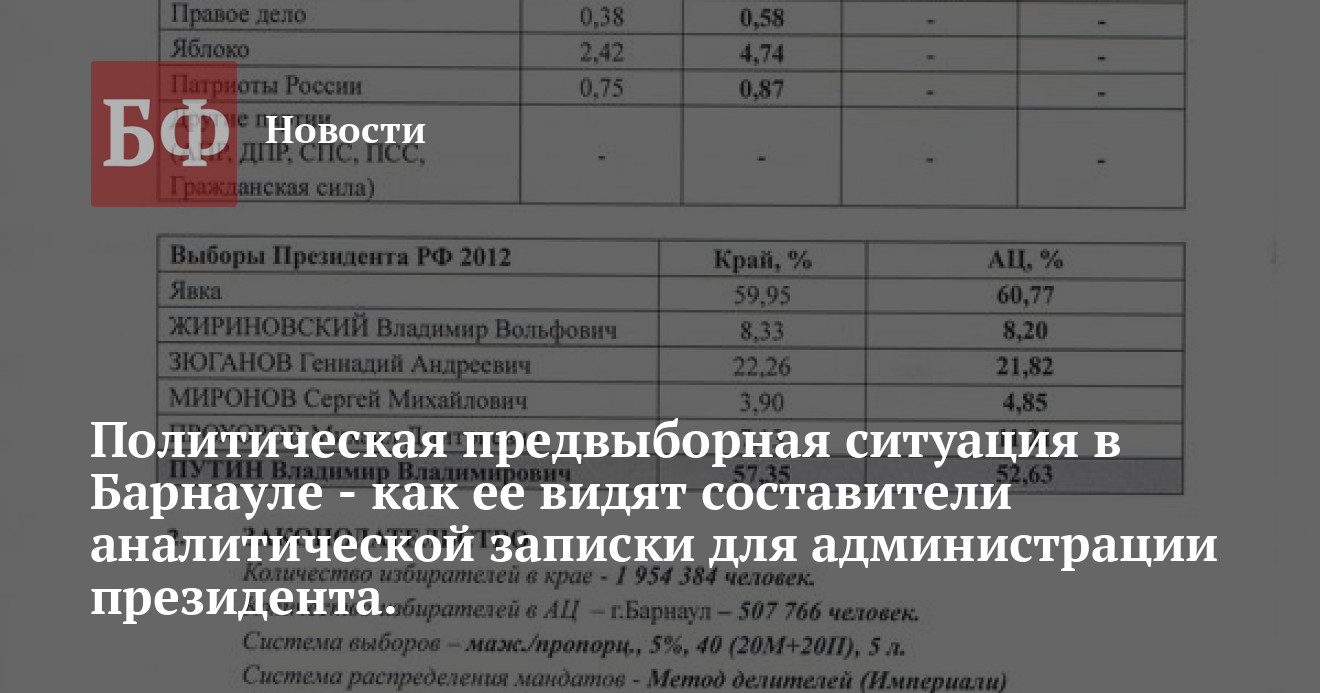 «Элитарная ситуация» в Барнауле оценивается как «относительно стабильная». «После смены главы администрации (Колганова), которым формировался действующий состав городской думы, под влиянием главы региона действующий глава администрации города Игорь Савинцев и городская дума выстроили достаточно конструктивные отношения, фракция партии (здесь и далее под „партией“ следует понимать „Единую Россию“ — прим. ред. „БФ“) в городской думе встроена в линию управления главы региона», — говорится в документе.