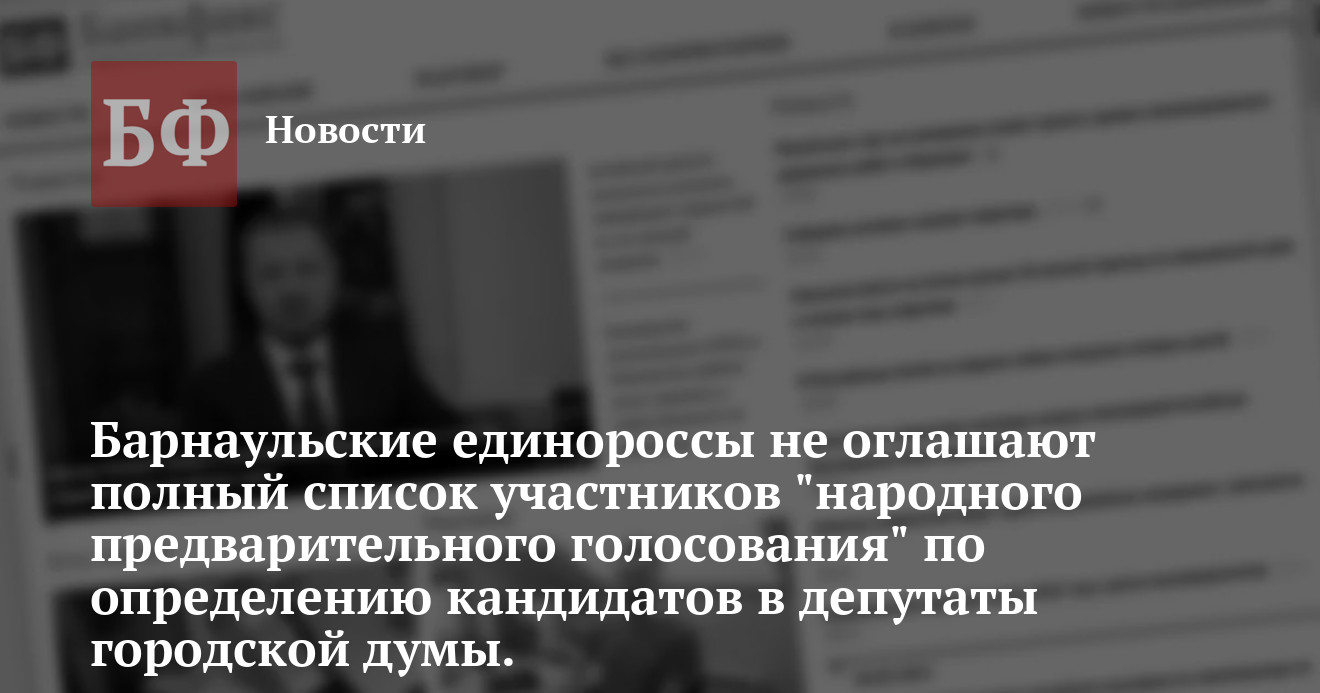 Полный список всех, кто подал заявки в качестве кандидатов, в пресс-службе алтайского реготделения партии «Единая Россия» на запрос ИА «Банкфакс» не предоставляют, ссылаясь на его отсутствие. В пресс-службе лишь отмечают, что «среди подавших заявки граждан есть люди самых разных возрастов и профессий», а «самым известным является глава администрации Барнаула Игорь Савинцев».