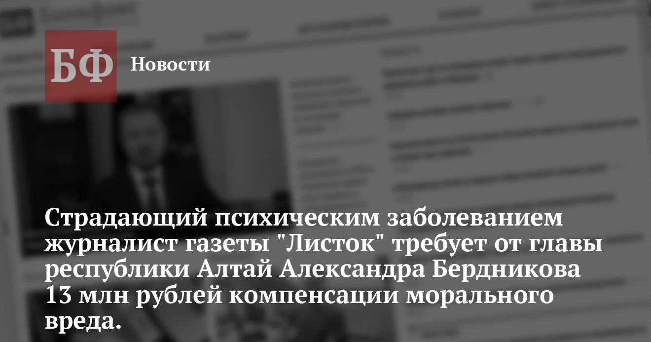 Алтай Александру Бердникову, в котором журналист требует взыскать с ответчика 13 млн рублей, сообщает сайт «Новости Горного Алтая».