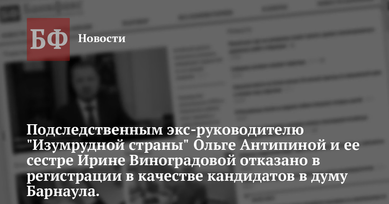 качестве кандидатов в депутаты Барнаульской городской думы экс-руководителю ассоциации «Изумрудная страна» Ольге Антипиной (выдвинулась по округу N 17) и её сестре, директору торгового дома «Изумрудный» Ирине Виноградовой (округ N 2).