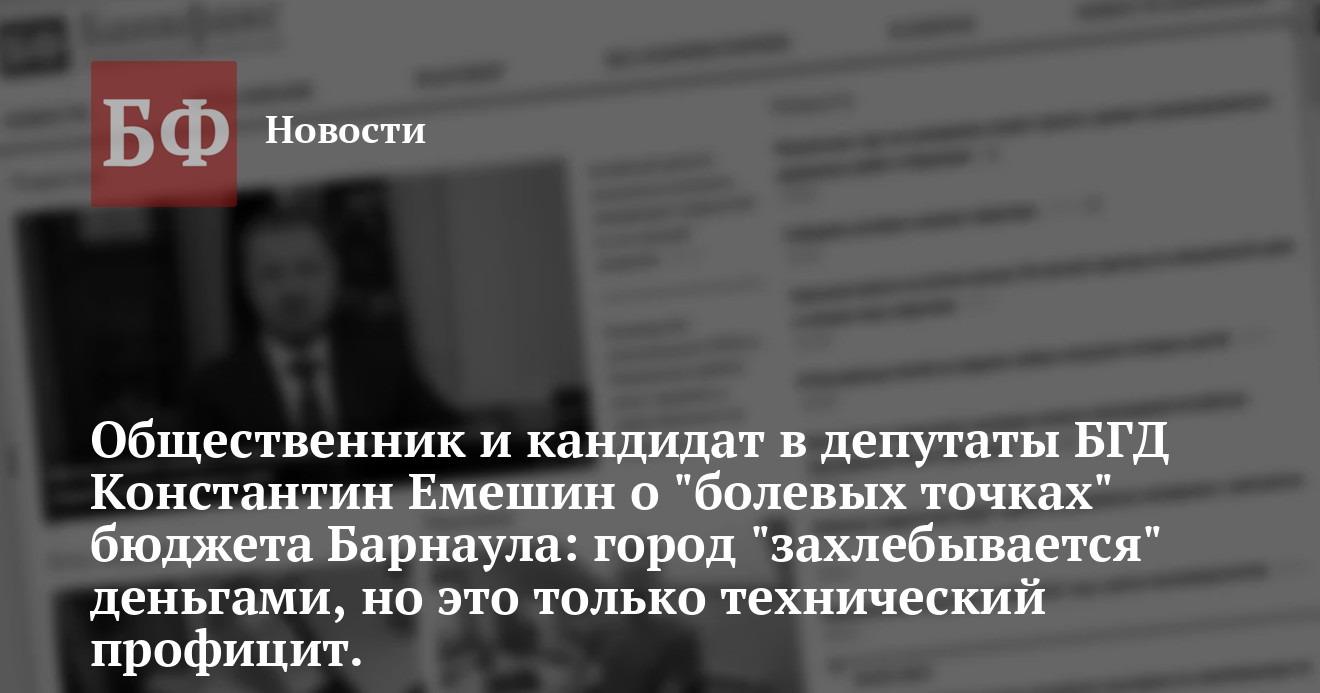 «Особенности экономической оценки ситуации в городе, к сожалению не столь оптимистичны, как обозначали докладчики. Если бюджет города строго оценить по критериям, то можно констатировать, что это оценка «Качество управление финансов высокое». Но к сожалению, в городе, как и в крае наблюдается традиционная беда — город «захлебывается в деньгах». Я имею ввиду, что механизмы расходования бюджетных средств так усложнены, что истратить эти деньги очень сложно из-за бюрократических препон. И поэтому сегодня реально наблюдается технический профицит бюджета, — считает Константин Емешин. — Хотя формально Барнаул «захлебывается» деньгами, это технический профицит, реально же в городе наблюдается серьезный дефицит около 500 млн рублей. Для его покрытия администрация вынуждена привлекать дорогой кредит в банке. Дешево этот вопрос можно было бы решить бюджетной ссудой из края, но реально в проекте бюджета по этой строке стоит «0». Хотя надо быть реалистами и понимать, что это одновременно и определенное средство давление края перед выборами в Думу — для обеспечения победы нужных кандидатов. Проблему 500 миллионов можно было бы решить иными путями, например, это традиционный механизм приватизации. Но анализ показал, что в казне не осталось сколько-нибудь существенных объектов. Только в 2012 году безуспешно повторяются конкурсы по продаже подвалов жилых домов. Некоторые уже по четыре раза выставлялись на продажу, но их никто не берет. Это показывает, что в казне остался хлам, который невозможно продать… Результаты 2012 года показывают, что в Барнауле заметно упали поступления в бюджет от малого бизнеса. Для любого города важны инвестпроекты, но Барнаул, к сожалению, полностью отсутствует на инвестиционной карте России. Это отражается и в цифрах по созданию новых рабочих мест. Так, в Барнауле за последний год открыты новые рабочие места при развертывании магазинов сети «Бахетле», «Лента» и НОВЭКС. Вот практически и все…"