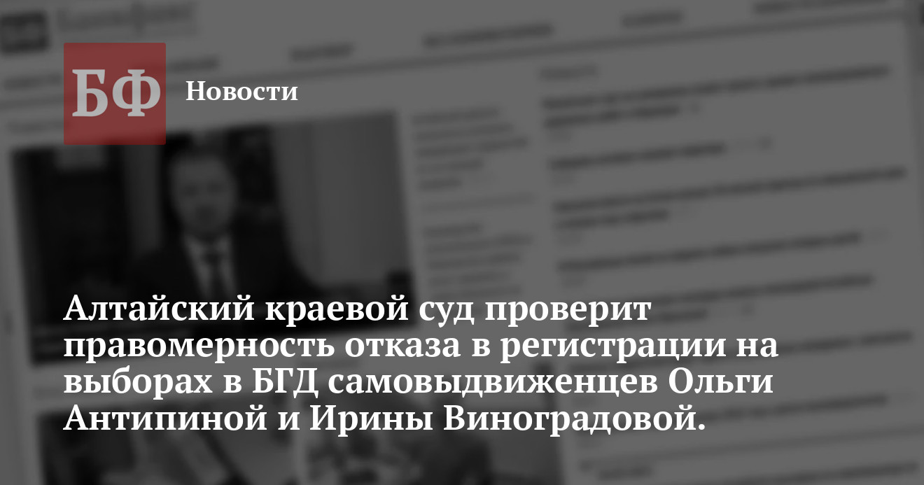 "Алтайский краевой суд проверит правомерность отказа в регистрации на выборах в БГД самовыдвиженцев Ольги Антипиной и Ирины Виноградовой."