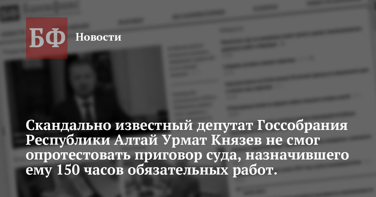 7 ноября Кош-Агачский районный отклонил жалобу депутата Госсобрания РА Урмата Князева на приговор суда первой инстанции, которым он был признан виновным в нанесении побоев и приговорен к 150 часам обязательных работ. Об этом сообщает сайт «Новости Горного Алтая».
