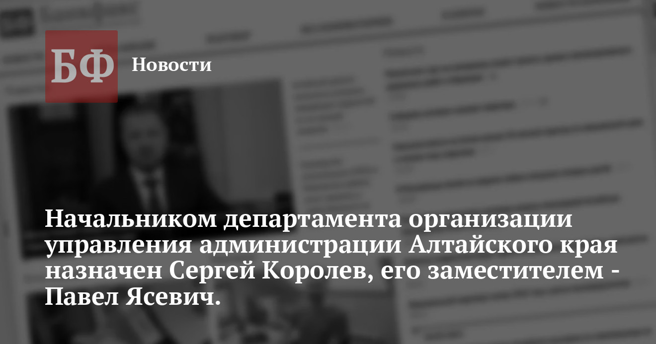 Сергей Королев назначен начальником департамента организации управления администрации Алтайского края распоряжением губернатора Александра Карлина. Об этом 7 декабря сообщается на официальном сайте региона.