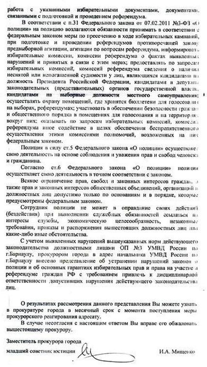 «В обоснование своих действий начальник отдела полиции N3 Барнаула Добровольский А. Г. ссылался на постановление главы администрации, которым установлен перечень лиц, имеющих право доступа в здание администрации Ленинского района города. Кандидат Калашников А. В., по словам Добровольского, в данном списке не значится… Между тем, никаких мер, в том числе правовых актов, направленных на ограничение свободного доступа лиц, указанных в ст. 30 Федерального закона „Об основных гарантиях избирательных прав…“ в помещения, предоставленные участковым и окружным избирательным комиссиям администрацией города не принималось», — говорится в ответе прокуратуры.