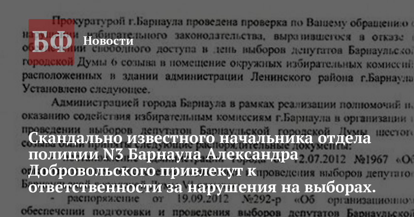 Прокуратура Барнаула усмотрела нарушения в действиях полковника полиции Александра Добровольского и его подчиненных, которые в день выборов депутатов Барнаульской думы не пускали в помещение окружной избирательной комиссии N 11 в здании администрации Ленинского района зарегистрированных кандидатов. Об этом сообщается в официальном ответе ведомства на обращение кандидата от КПРФ