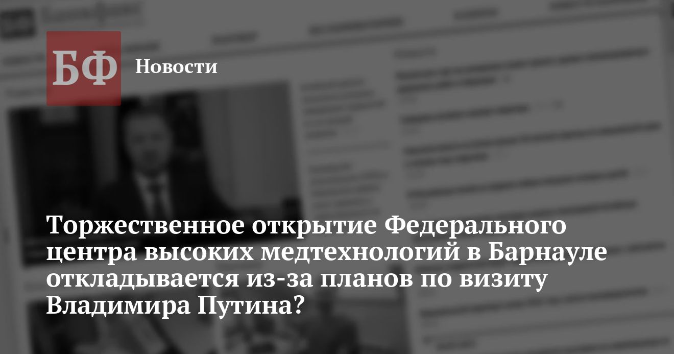 Дата торжественной церемонии открытия Федерального центра высоких медтехнологий в области травматологии, ортопедии и эндопротезирования в Барнауле до сих пор не известна. Мероприятие откладывается в связи с обсуждаемой возможностью участия в нем президента страны Владимира Путина, сообщил источник ИА «Банкфакс» в администрации Алтайского края.