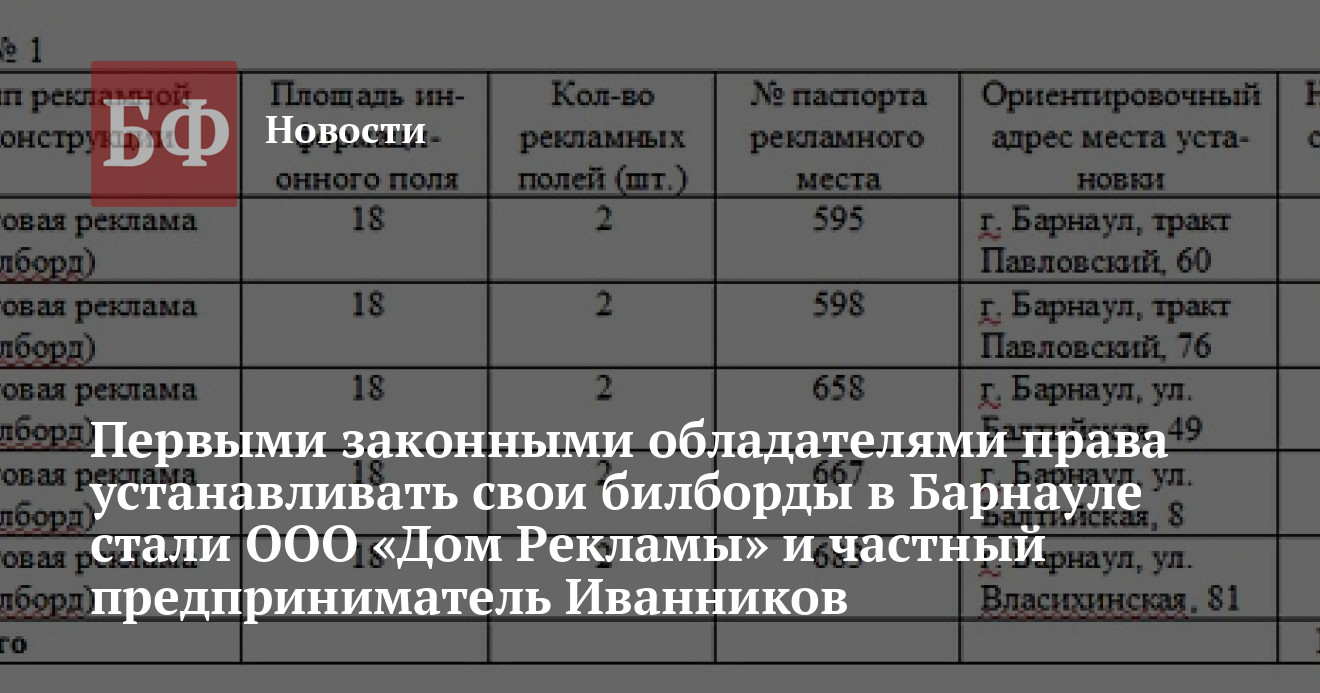Фонд имущества Алтайского края 28 января провел первые торги по продаже права на заключение договоров по установке и эксплуатации рекламных конструкций в черте Барнаула. За реализацию 20 земельных участков в Индустриальном районе в общей сложности выручено 2 млн 643 тысячи рублей, сообщает сайт ведомства.