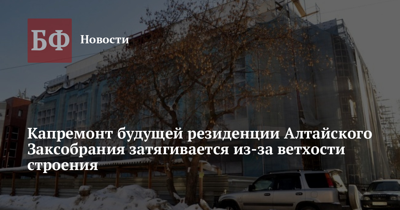 Капитальный ремонт здания на ул. Анатолия, 81 в Барнауле, куда в будущем переедет Алтайское Заксобрание, планируют завершить в ближайшие месяцы. Монтаж навесного фасада завершится к 15 марта, а отделочные работы внутри строения — к 1 апреля 2013 года, сообщили ИА «Банкфакс» в СПП ОАО «СтройГАЗ», которое является подрядчиком работ.