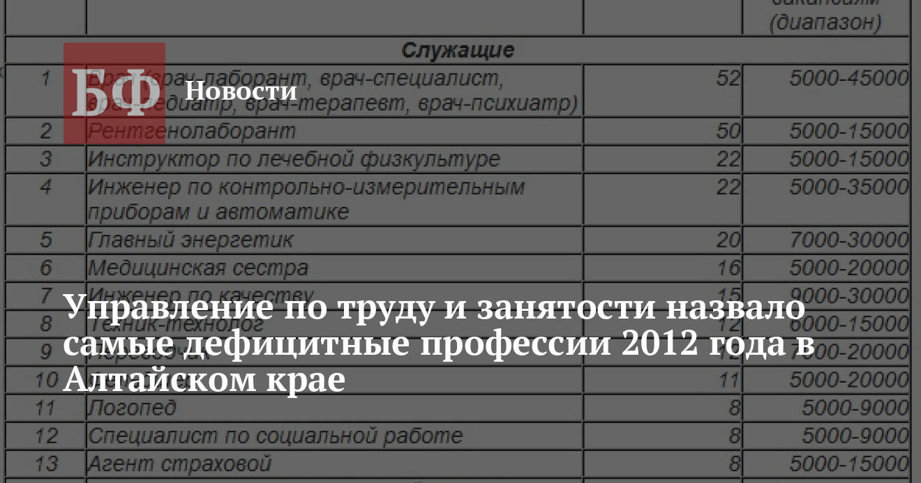Специалисты управления Алтайского края по труду и занятости населения составили перечень дефицитных профессий по итогам 2012 года, сообщает сайт ведомства.