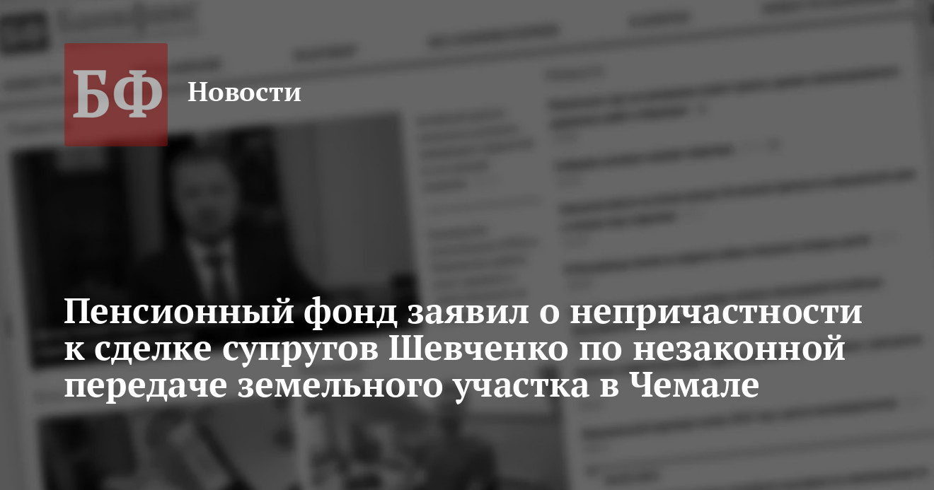 12 февраля на сайте прокуратуры региона была размещена информация о том, что в Чемальском районе обнаружен факт незаконной передачи руководством муниципалитета местному филиалу Пенсионного фонда РФ земельного участка площадью 109 кв. м на 49 лет под строительство административного здания. «Обращаем внимание, что речь в данной информационной статье идет о предоставлении Ольге Шевченко (руководитель районного отдела Пенсионного фонда — прим. ред. „БФ“) земельного участка как частному лицу. К деятельности Пенсионного фонда России данный факт не имеет абсолютно никакого отношения», — уточнила пресс-служба ведомства, добавив, что публикация, размещенная на сайте прокуратуры, уже откорректирована.