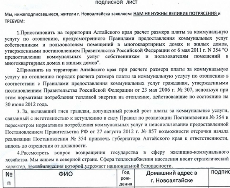 По словам Черданцева, жители города слушали с недоверием, затем стали сами выходить к трибуне, задавая вопросы представителям власти. Эти вопросы приобретали все более риторический характер и больше напоминали выступления на митинге с возмущением и критикой в адрес власти. Тут же на основе предложений горожан было составлено обращение, где жители требуют срочно приостановить на территории Алтайского края действие постановления правительства № 354, в соответствии с которым изменился порядок расчета платы за коммунальные услуги. Кроме того в обращении предлагается привлечь к ответственности губернатора региона, «вплоть до отрешения от должности» — за то, что допустил резкий рост платы за коммунальные услуги и не использовал возможность отсрочки реализации постановления № 354.