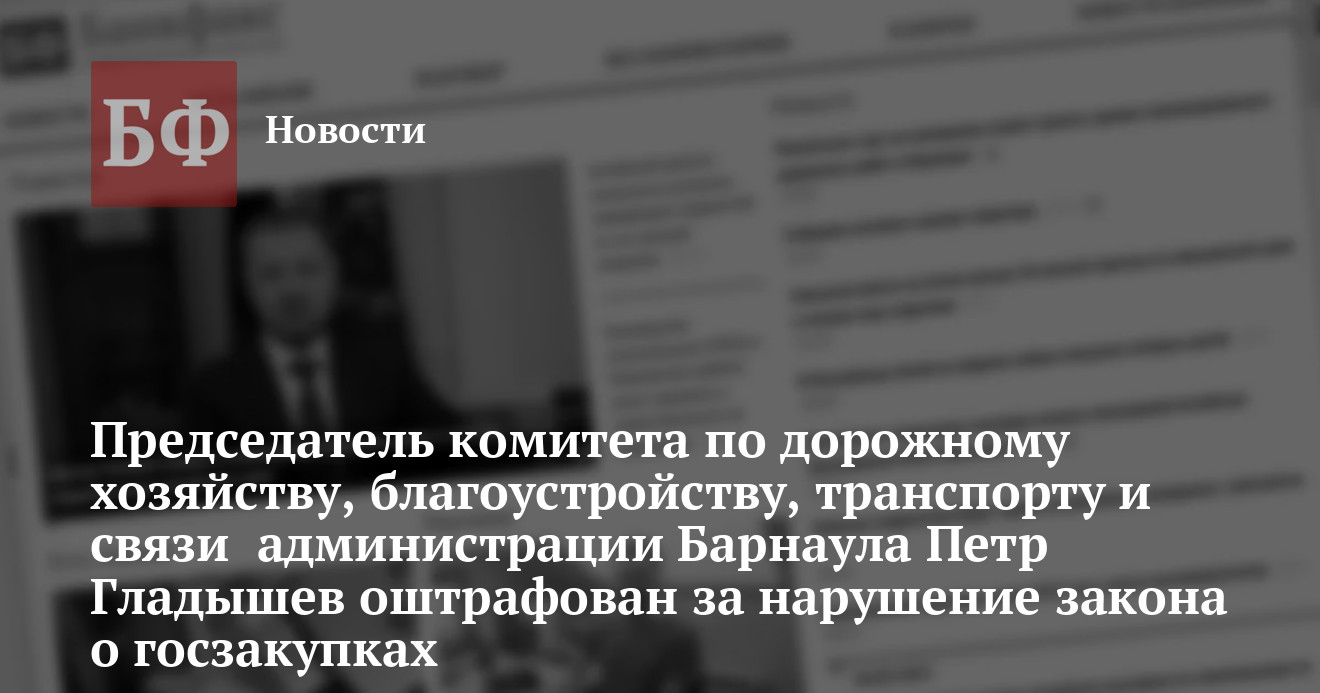 Как стало известно ИА «Банкфакс», председатель комитета по дорожному хозяйству, благоустройству, транспорту и связи администрации Барнаула Петр Гладышев 14 февраля был оштрафован УФАС за заключение с ООО ПСК «Индустрия» контракта на ремонт подъездных путей к краевой клинической больнице. Цена контракта составила 26 514 229,9 рублей.