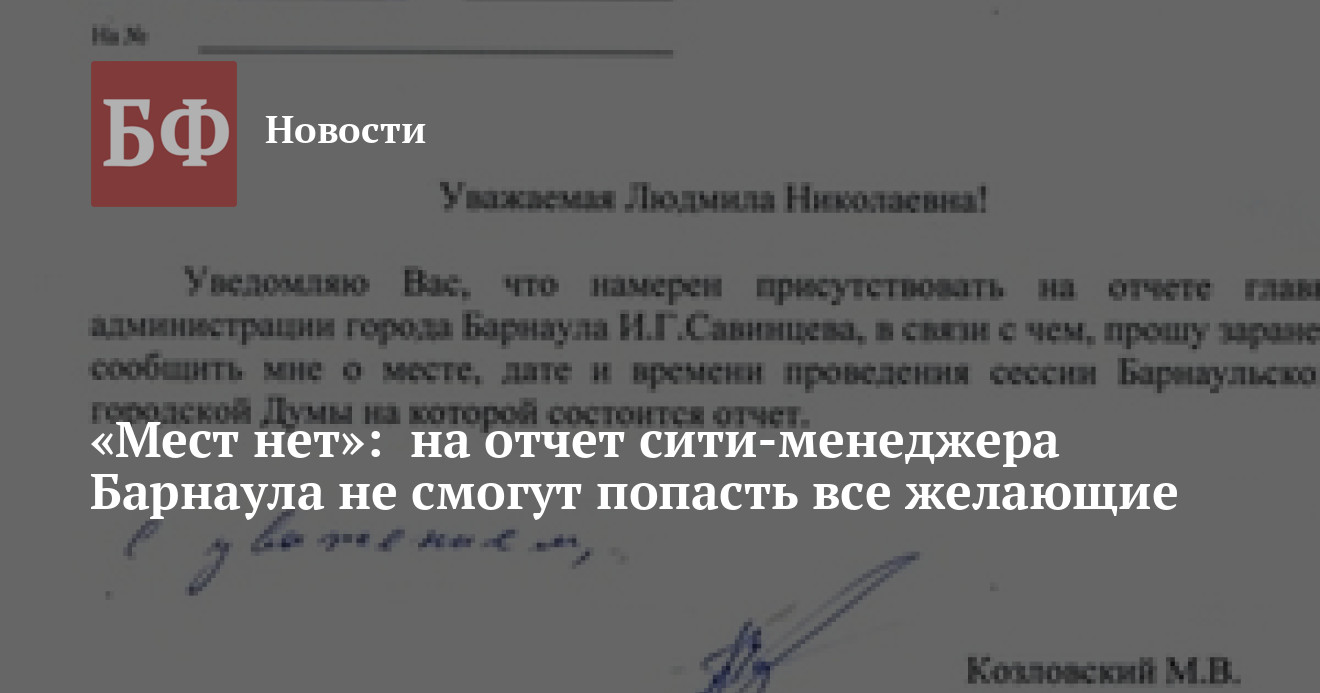 Из-за избытка «широкой общественности», приглашенной на отчет главы администрации Барнаула, в зале заседаний не нашлось места депутату-коммунисту. Такой вывод делают в Алтайском крайкоме КПРФ из ответа главы города Людмилы Зубович депутату АКЗС Марку Козловскому, письменно заявившему о намерении присутствовать на заседании Барнаульской городской думы, на котором сити-менеджер Игорь Савинцев выступит с ежегодным отчетом.