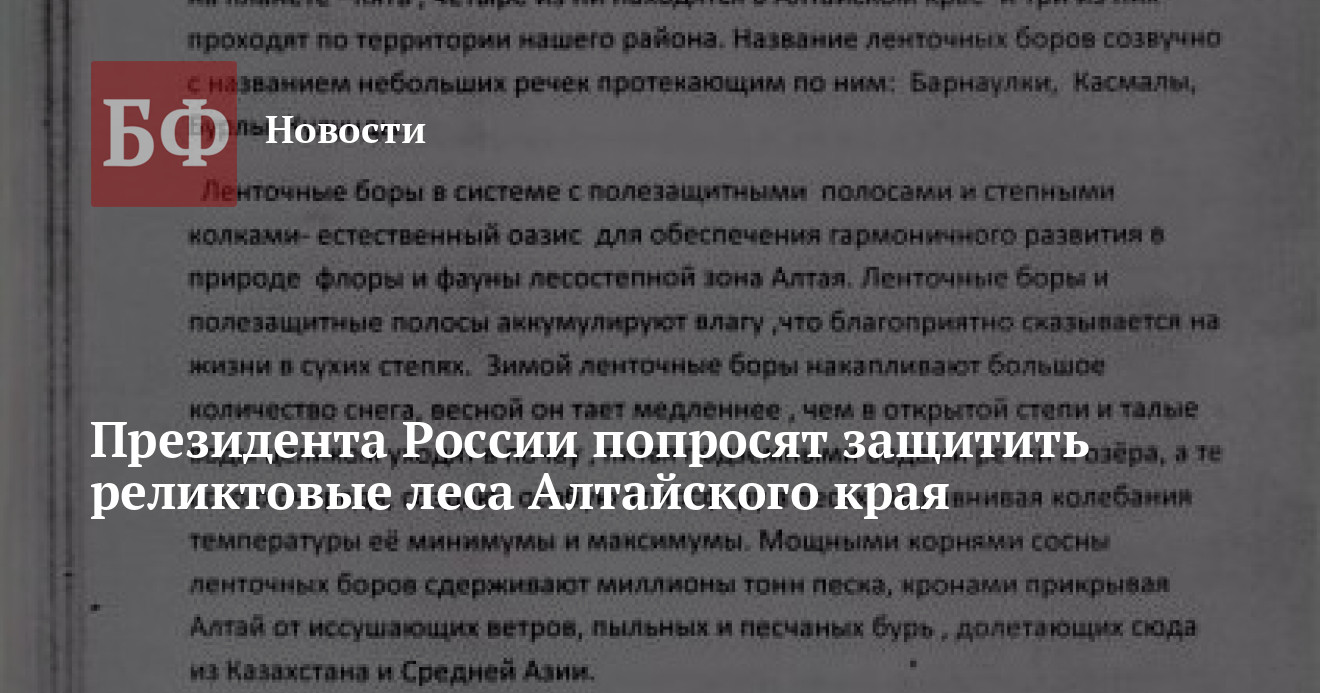 «Надвигается экологическая катастрофа, — цитирует заявление депутата Ивана Ялымова сайт „Геблеровского экологического общества“. — Местные власти не принимают мер по охране леса. Действующая система лесного хозяйства позволяет вести бесконтрольную вырубку, уничтожающую ленточные боры. Заготовку леса ведут предприятия, входящие в холдинг „Алтай-Лес“, охрану леса контролирует управление лесами края. Но странное дело — лесная охрана не выявляет нарушений и никак не наказывает арендаторов, занимающихся заготовкой древесины. Заготовка ведется весь год, на лесосеках гибнет до 90% молодой поросли, а при трелевке леса разрушается верхний слой почвы. Кроме того, лес не перерабатывается там, где он заготавливается, а порубочные остатки вообще не используются, как раньше делалось в нашем лесхозе. Сейчас в порубочных остатках интенсивно развиваются вредители, которые заражают здоровые деревья. В Мамонтовском лесничестве планы вырубки — до 50 и более тысяч куб.м. на год — а несколько лет назад эта цифра была не больше 13−14 тысяч куб.м. При этом выбираются самые лучшие деревья, а остается больной лес, который как раз и должен вырубаться. Лесничества же требуют от лесников составлять „правильные“ отчеты по лесопользованию и вынуждают выполнять варварские планы вырубки. При таких темпах через 1−2 года рубить будет нечего…»