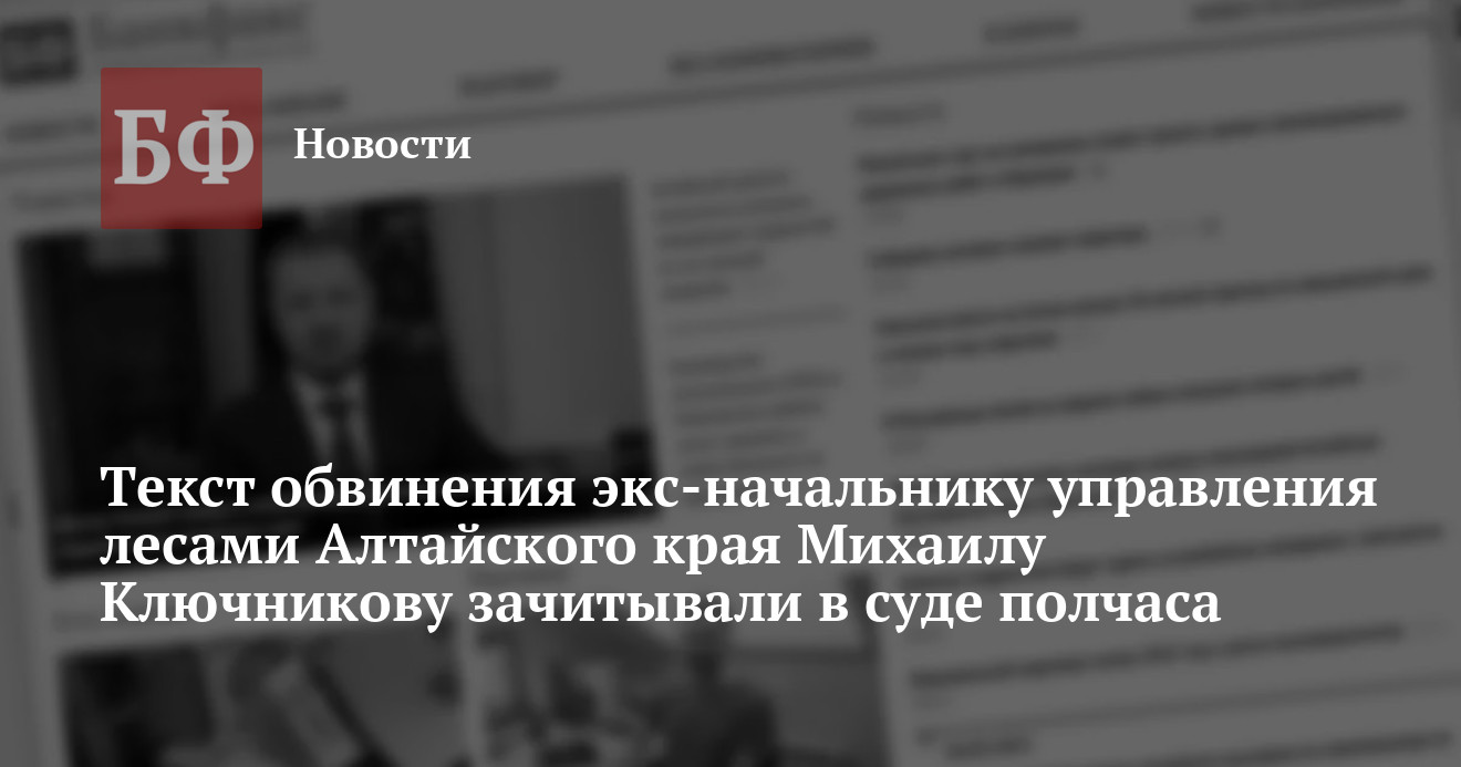 Первое заседание Центрального районного суда Барнаула по уголовному делу бывшего начальника краевого управления лесами Михаила Ключникова состоялось 11 апреля. Он обвиняется в трех эпизодах превышения должностных полномочий (ч. 1 ст. 286 УК РФ).