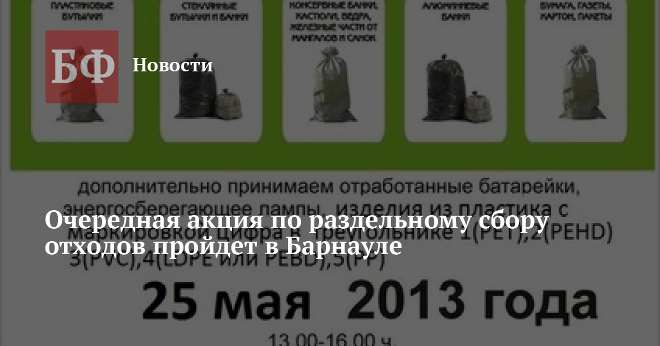 Вторсырье будет приниматься 25 мая с 13:00 до 16:00 на парковке магазина «Прораб» (проспект Космонавтов, 8/2) и возле входа в Барнаульский зоопарк (улица Энтузиастов, 10а).