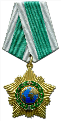 Знак ордена изготавливается из серебра с нанесением позолоты. Основой знака ордена является пятиконечная штраловая звезда. На звезду в ее центре наложено изображение земного шара. Детали изображения покрыты разноцветной эмалью. Земной шар заключен в венок из лавровых ветвей зеленого цвета. На лавровом венке вокруг изображения земного шара расположены небольшого размера рубины. На оборотной стороне знака имеется надпись «Мир и дружба». Там же нанесен номер знака ордена. Размер ордена между противоположными концами его звезды составляет 44 мм. На конце верхнего луча звезды имеется ушко, через которое, при помощи кольца, знак ордена крепится к пятиугольной колодке. Колодка обтянута муаровой лентой зеленого цвета, по краям которой проходят голубые полосы. Размер ленты в ширину – 24 мм, а голубых полос – 6 мм. Миниатюрная копия знака ордена из металла с эмалью, имеет размер 13 мм. Крепится на ленте в форме розетки размером 15 мм.
