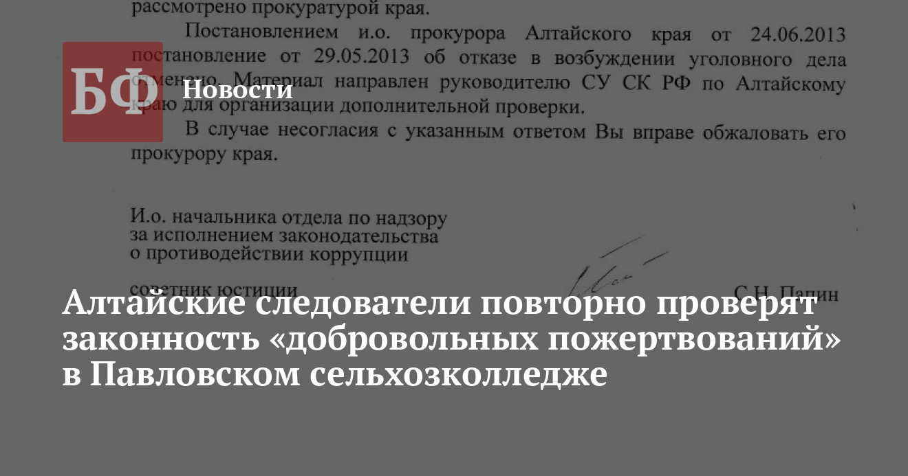 25 июня прокуратура Алтайского края отменила постановление об отказе в возбуждении уголовного дела о незаконных действиях директора Павловского сельскохозяйственного колледжа, а также депутата АКЗС Михаила Бердника, сообщает пресс-служба Всероссийского студенческого союза.