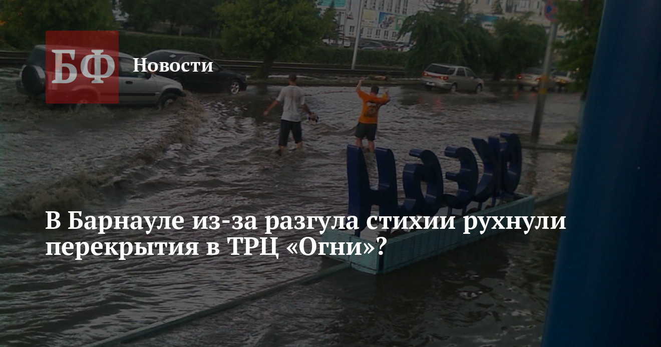 Вечером 8 июля на форуме сайта drom.ru появилась информация о том, что из-за сильного дождя в барнаульском ТРЦ «Огни» рухнули перекрытия на фудкорте, в кинотеатре, а также в супермаркете «Мария-Ра» на первом этаже.